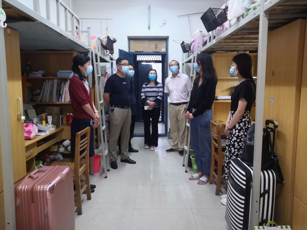 老师们先在学校南门迎接返校毕业生,与刚刚到达的毕业生亲切交谈,询问学生返校路途情况,为学生送去防疫物资和慰问品;在走访宿舍过程中,老师们仔细询问了毕业生生活情况、毕业去向和离校准备情况,叮嘱同学们科学防疫,遵守学校疫情防控期间各项管理制度,返校期间做好防疫措施,戴口罩,勤洗手,保持安全距离,不聚会,不聚餐,注意安全。离校期间有任何困难及时反映,学院和老师们会及时帮助解决。同时,鼓励同学们在新的工作岗位和进一步的深造中,脚踏实地,砥砺前行,希望毕业生在以后的工作和生活中,怀感恩之心,常回母校看看。