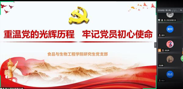 为庆祝中国共产党成立99周年,进一步激发学生党员的爱国热情和责任担当,7月1日晚8点,食品与生物工程学院研究生党支部开展了微党课人人讲活动,活动通过腾讯会议形式开展,支部全体党员参加了本次活动。