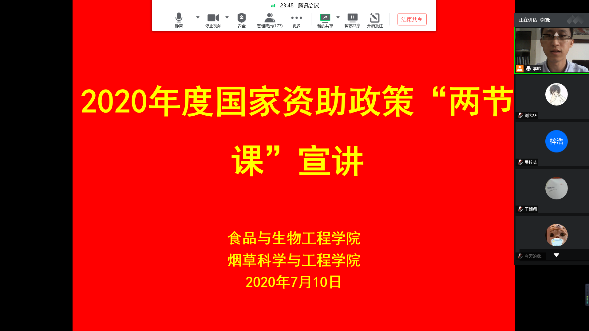 为广泛宣传国家资助政策、提高学生的政策知晓度,进一步落实好国家资助政策宣传“两节课”工作,食品与生物工程学院于7月10日上午,通过腾讯会议召开2020年度国家资助政策线上宣讲会,学院负责资助工作的李皓老师、各班班长团支书、组宣委员、学生代表以及寝室长参加了本次宣讲会。