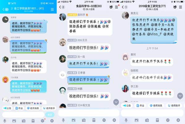 课堂上,同学们全体起立,齐声对老师说:“老师好!祝您教师节快乐!您辛苦了!”一声声问候表达了学生对老师诚挚的敬意和感谢。同学们还发挥巧思,通过线上及线下多种形式,向老师送去朴实而真诚的节日祝福。2017级、2018级本科生以师生课下交流的方式,与老师面对面共话成长。2019级学生代表为老师献上小花篮并祝老师教师节快乐。我院研究生还为老师送上充满敬意与爱意的绿色小盆栽和自制卡片。此外,同学们还通过短信、微信、QQ等方式向老师表示感谢,送去祝福。