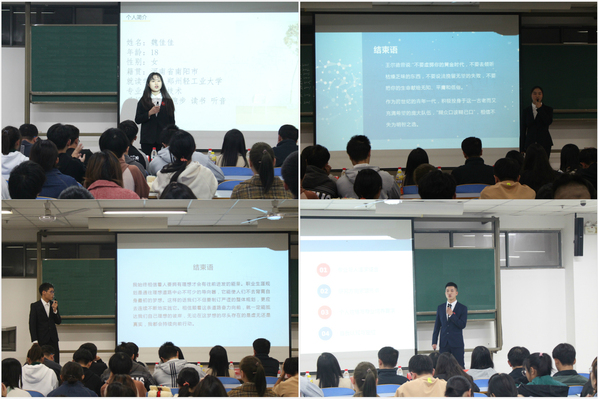 本次比赛通过前期广泛宣传,同学们踊跃报名,层层筛选后,共有12名同学进入最后现场展示环节。比赛开始李书记进行了致辞,随后,主持人公布比赛规则,参赛选手按照抽签顺序依次上台进行展示。各位选手结合PPT分别从自我认知、职业认知、职业决策、计划与路径、评估与调整、职业道德等六个方面进行展示。经过激烈角逐,大赛评选出一二三等奖并进行了颁奖。