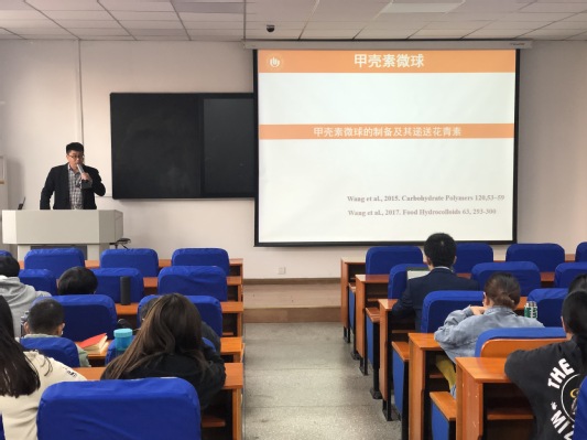 望运滔博士报告主题为“甲壳素多酚相互作用在食品体系中的应用”。望博士首先对甲壳素、多酚的结构及其在自然界中存在形式进行简单介绍,并讲述了甲壳素微球的制备及其递送花青素的作用机理,随后讲解一步法增强甲壳素膜的抗菌及抗氧化性能,最后重点讲述了甲壳素单宁酸相互作用增强胶体颗粒的乳化性能。
