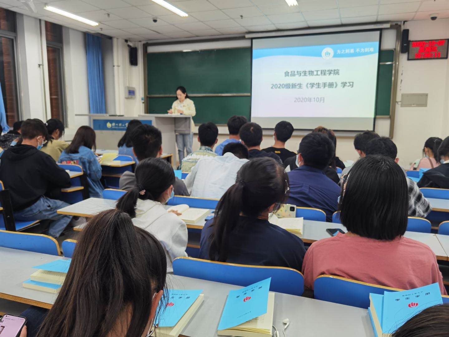 为进一步规范学生的行为举止,强化学生的纪律规矩意识,培养良好学风,塑造新时代大学生的良好形象,食品与生物工程学院于10月28——30日分时段、分班级开展了2020级新生学习《学生手册》活动。