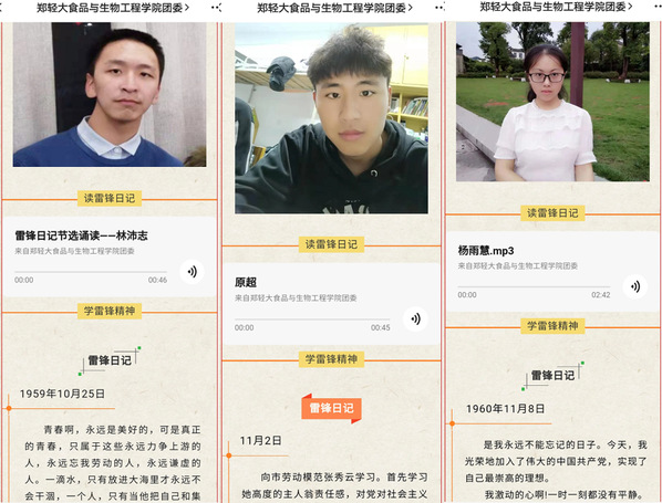 为引导青年团员更好地继承和弘扬雷锋精神,厚植爱国情怀、讲好红色故事,食品与生物工程学院在团员青年中开展“读雷锋日记,学雷锋精神”—雷锋日记接力诵读线上主题活动。