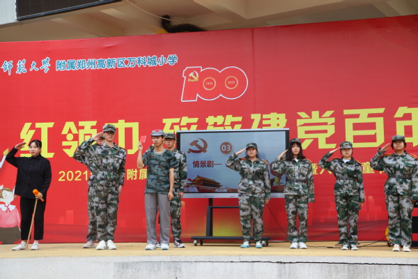 活动现场,志愿者首先引导小学生从认识党旗、党徽开始,逐步展开党史讲述,通过“半条被子”“军需处长”的故事向大家生动阐述了什么是共产党;通过讲述不同历史时期涌现出的优秀共产党员及其主要事迹,阐明中国共产党的性质和宗旨以及共产党人的初心和使命。抗日英雄杨靖宇、两弹元勋邓稼先、全国脱贫攻坚楷模黄文秀……一代代共产党人为民族复兴,国家富强,人民幸福奋不顾身、前赴后继,小学生们无不被他们心怀家国,舍生忘死的精神深深震撼。第二个环节,志愿者们通过情景剧表演的形式再现了长征路上的革命故事,生动演绎了红军战士不畏艰难,不怕牺牲的高尚品格和革命理想高于天的坚定信念,台下的孩子们深受感染,现场气氛热烈,掌声不断。第三个环节,志愿者和万科小学的学生代表一起朗诵《少年中国说》,朗诵者们声音铿锵有力,感情充沛饱满,诵出了祖国的英姿,诵出了少年的气势,极大的激发了同学们的爱国热情。最后,志愿者现场教学歌曲《没有共产党就没有新中国》,在钢琴伴奏下,现场同学们的合唱歌声响彻整个校园,此次活动也在嘹亮的歌声中拉下帷幕。小学生们纷纷表示要珍惜当前的幸福美好生活,努力学习科学文化知识,学习革命先烈勇敢无畏的精神品质,为建设更加强大的祖国贡献自己的力量。
