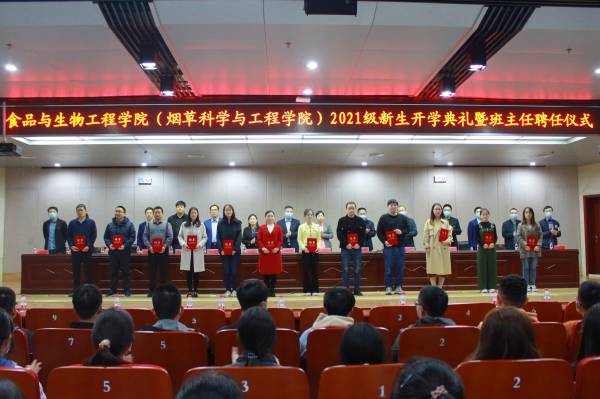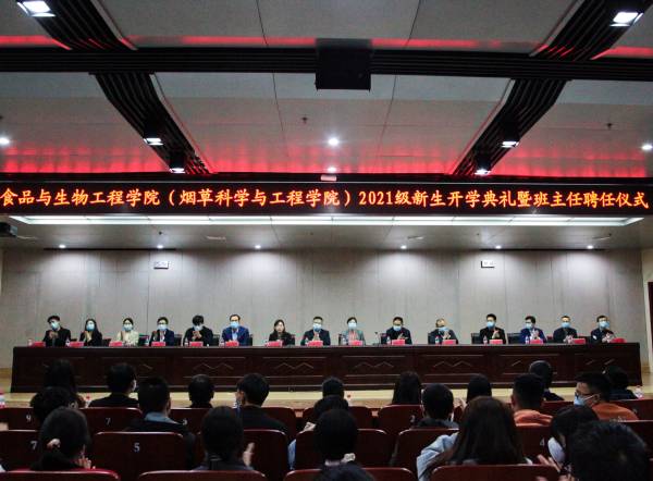 10月17日上午,食品与生物工程学院(烟草科学与工程学院)2021级新生开学典礼暨班主任聘任仪式在科学校区逸夫图书馆学术报告厅隆重举行。学院党政领导、各系(实验中心)主任、新生班主任、全体辅导员老师和2021级新生参加了典礼。典礼由学院党委副书记李英梅主持。