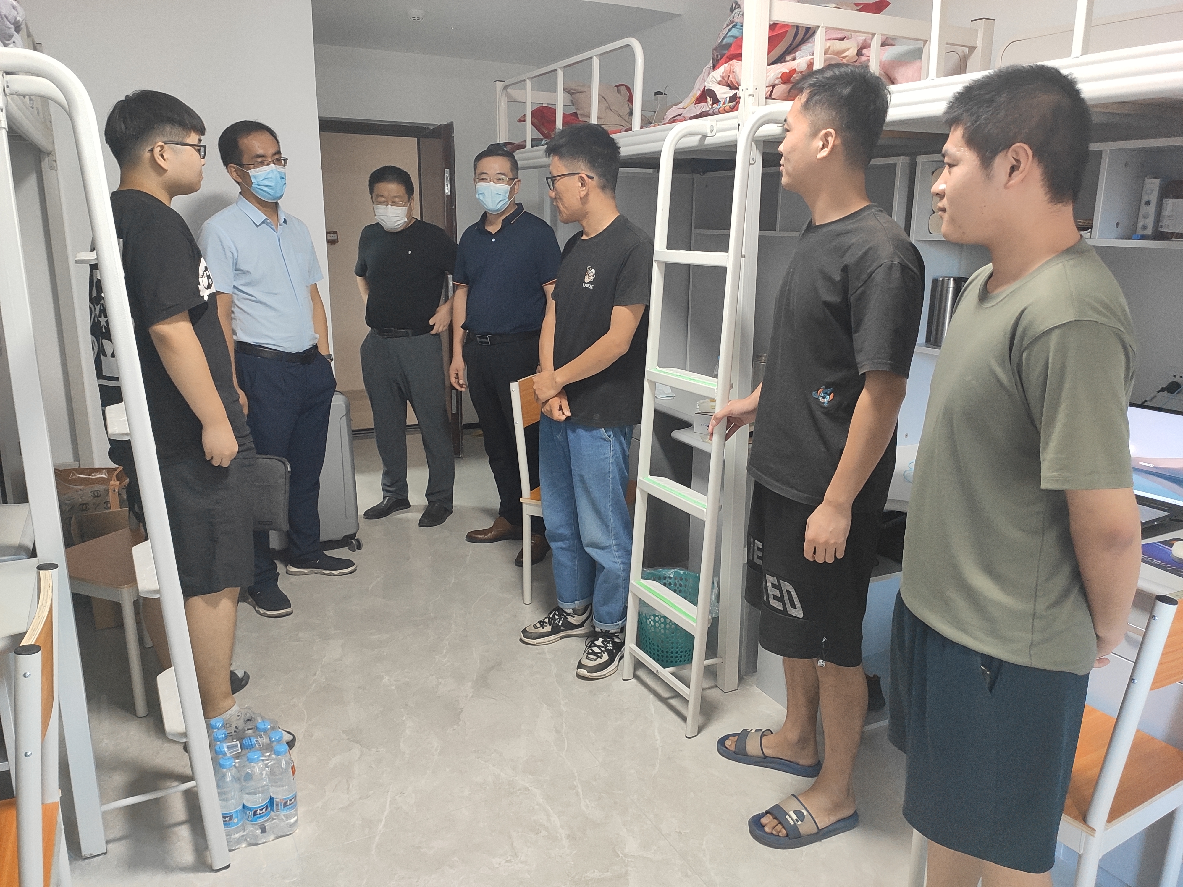 在走访中,学院领导老师与同学们亲切交流,详细询问了同学们的报到情况、对宿舍环境的适应程度、生活上是否遇到什么问题以及毕业院校专业学习情况等。叮嘱同学们要注意加强返校后的个人防护,保持良好心态,及时向家人报平安,让家人放心。同时提醒大家,在疫情防控常态化背景下,希望各位同学理解并自觉遵守学校疫情防控管理规定,涵养良好心态,做好防护工作,按时参加核酸检测,在学习和生活中遇到问题及时向老师寻求帮助;同时,鼓励大家明确未来规划,提高抗压能力,锤炼过硬本领,度过充实的研究生生活。