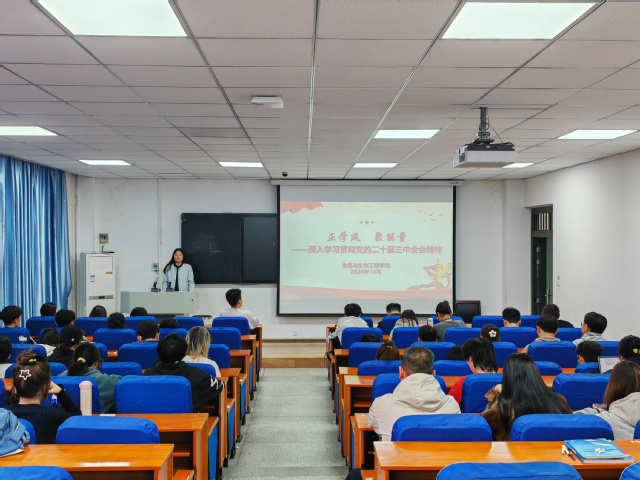 为进一步推动党的二十届三中全会精神和习近平新时代中国特色社会主义思想的学习宣传贯彻走深、走实、走心。近日,食品与生物工程学院在食工楼209教室开展党的创新理论学习宣讲活动。学院团委书记李燕主讲,本科生党支部全体学生党员参会。