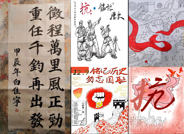 本次大赛得到了同学们的积极响应和热情参与,征集作品内容丰富、形式多样,大家在创作中深切感受红色历史的深邃、领悟“一二·九”运动的精神内涵。书法作品风格各异,毛笔硬笔、各种书体一应俱全,一笔一划间复现历史的厚重,描摹先辈的坚毅;绘画作品形式多样,视角独特,或勾勒线条讲述故事,或以色彩晕染描绘情感,或精细绘制历史场景,或聚焦个人捕捉英雄形象。挥毫泼墨书写峥嵘历史,丹青妙手复绘青春华章。展开画纸,对历史的回想具象成画;提起笔墨,心中的敬畏撰写成行,这一幅幅作品,是历史的回响,是精神的共鸣,是铭记,是传承。