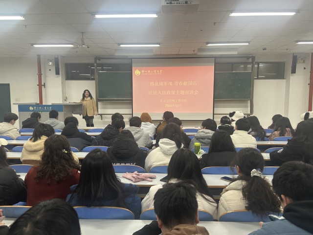 为进一步做好大学生参军入伍政策宣传工作,激发学生随笔从戎、参军报国的热情,12月20日,食品与生物工程学院在二教楼816召开“热血铸军魂 青春献国防”大学生参军入伍主题宣讲会。