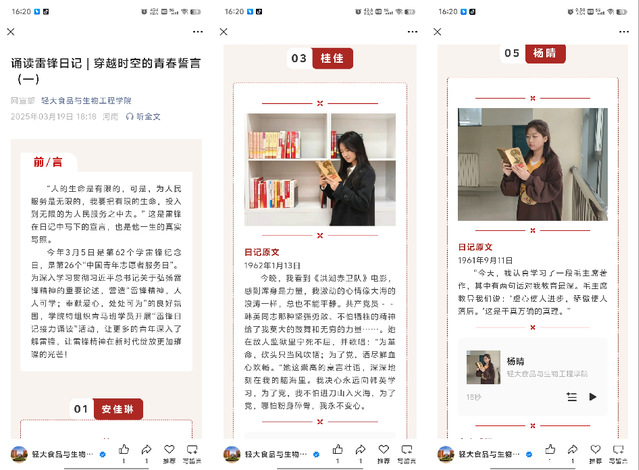 《雷锋日记》作为跨越时代的红色经典,生动展现了雷锋精神全心全意为人民服务的核心价值,其诉说着一个共产主义战士的远大理想,跃动着蓬勃不息的时代脉搏,现在读来仍震撼着当代青年的心。三十名青马学员通过接力诵读的形式重温《雷锋日记》,并录制《雷锋日记》音频,发表个人学习感悟,以推文形式的方式在学院公众号推送,让更多的学生感受雷锋精神的时代魅力。从“一滴水,只有放进大海里,才能永远不会干涸”“人的生命是有限的,可是为人民服务是无限的”“真正的青春,只属于这些永远力争上游的人”……同学们从一句句真挚的话语中触摸到了有温度的雷锋精神,真切感受到了信仰的力量。大家纷纷表示要将理论学习转化为行动指南,从点滴小事做起传递温暖,以实际行动诠释新时代青年的信仰与担当。