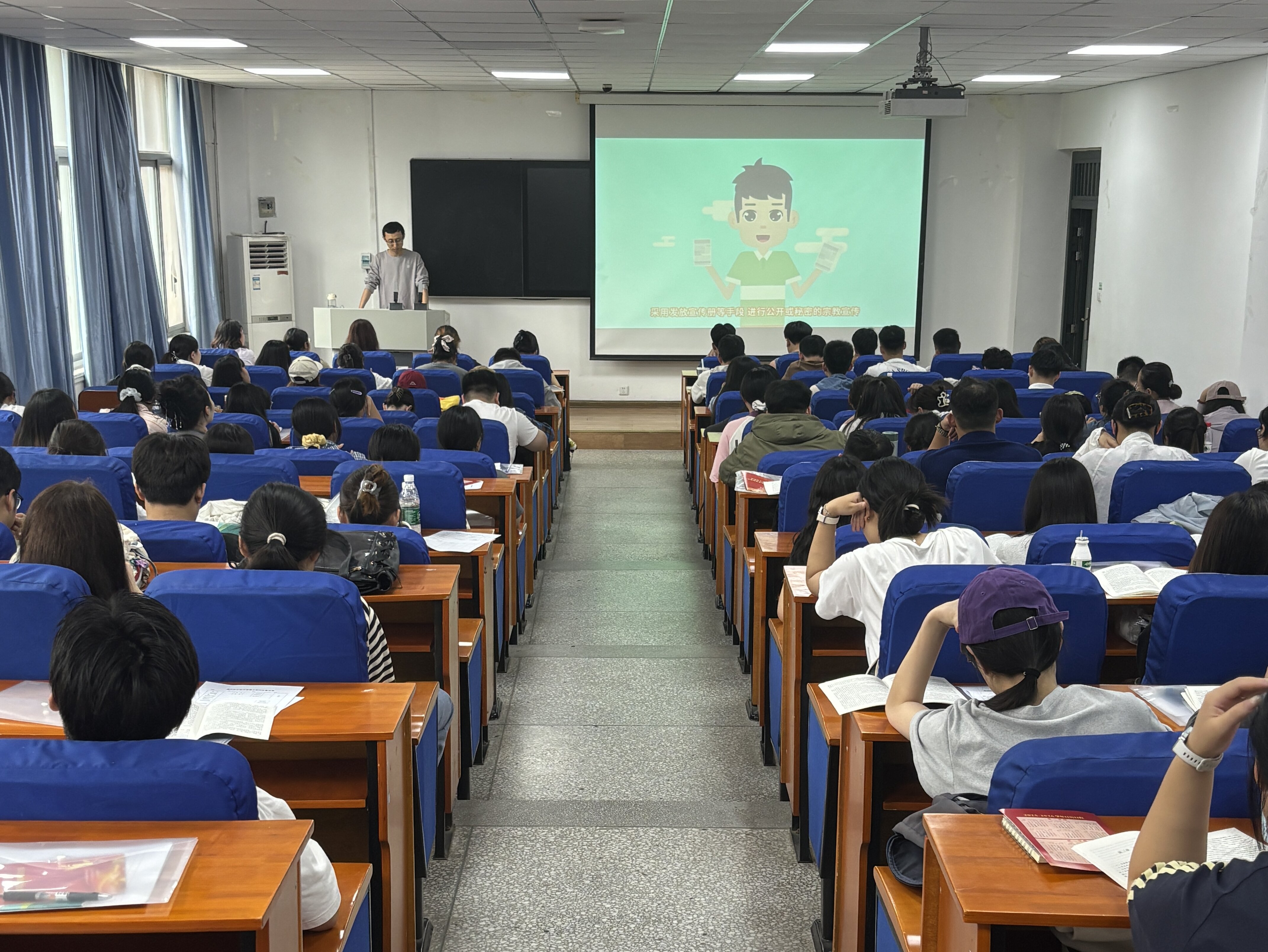 活动中,辅导员老师从国家的民族政策、马克思主义宗教观和党的宗教政策有关法律法规等方面进行了详细讲解,领学了《大学生中国特色社会主义民族宗教理论知识手册》相关内容,引导同学们树立正确的宗教观,增强辨析宗教与科学的本领,认清邪教和封建迷信的本质,牢记并遵守“两个不得”和“五个严禁”内容,从而更加坚定理想信念,增强担当民族复兴重任的责任感和使命感。随后,李老师组织学生观看了宗教政策法规宣传视频,并通过具体实例引导学生正确防范和抵御境外敌对势力及宗教向校园渗透。希望同学们在未来的生活中坚定理想信念,加强思想政治理论的学习和实践,牢固树立正确的世界观、人生观、价值观。