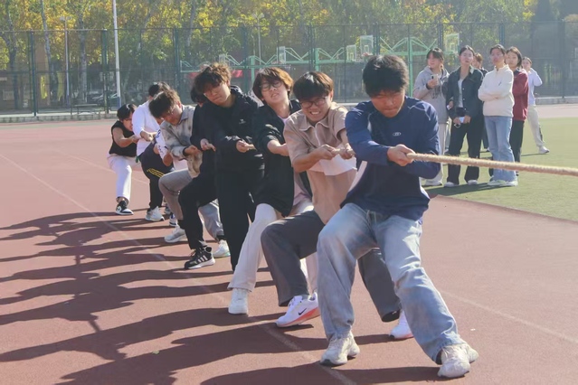 本次活动由学院2025级的13个班级选拔男、女生代表组成联队参与。跳绳比赛采用积分制,三分钟内跳的最多的一队获胜,拔河比赛与篮球比赛为淘汰制,先进行抽签,决定对阵顺序,赢的一方继续进行比拼,直到决出胜者。活动现场活力爆棚,处处洋溢着青春朝气与竞技热情。跳绳赛场,选手们默契配合、步伐整齐,彩绳翻飞间尽显灵动;拔河场地,队员们紧握长绳、脚蹬实地,在助威声中集体发力,红线拉锯间凝聚着团结的力量;篮球场上,球员们攻防转换灵活,精准传球、果断投篮的精彩瞬间,引得场边欢呼不断。三大项目点燃了新生的参与热情,让运动场成为青春绽放的舞台。经多轮激烈比拼,跳绳项目中,女子组食品营养与健康2501&食品营养与健康2502联队以68分摘得桂冠;拔河项目中,男子组食品营养与健康2501班、女子组食品科学与工程2503班分别斩获头筹;篮球项目中食品为之创新2501&生物工程2501联队获得冠军。