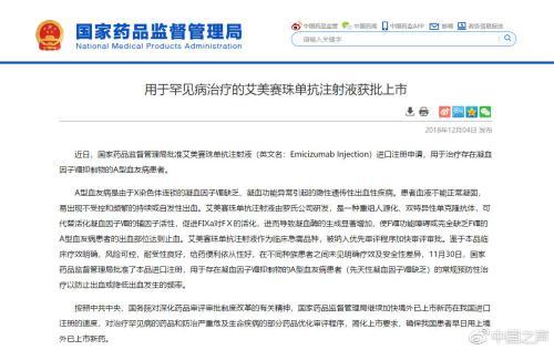 国家药监局方面介绍,艾美赛珠单抗注射液由罗氏公司研发,是一种重组人源化、双特异性单克隆抗体,可促进凝血酶的生成,使A型血友病患者的出血部位止血。