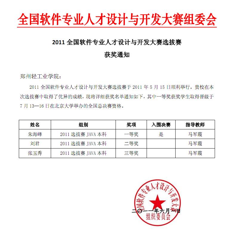 据悉,获得一等奖的朱海峰同学目前正在积极备战2011年7月在北京大学举办的全国总决赛。总决赛期间,大赛组委会还将邀请IT领域教育专家、教育一线的教学组织者和实践者、产业一线的技术专家和人力资源专家,共同围绕软件人才培养开展研讨。 软件学院 2011年6月14日 附:获奖通知