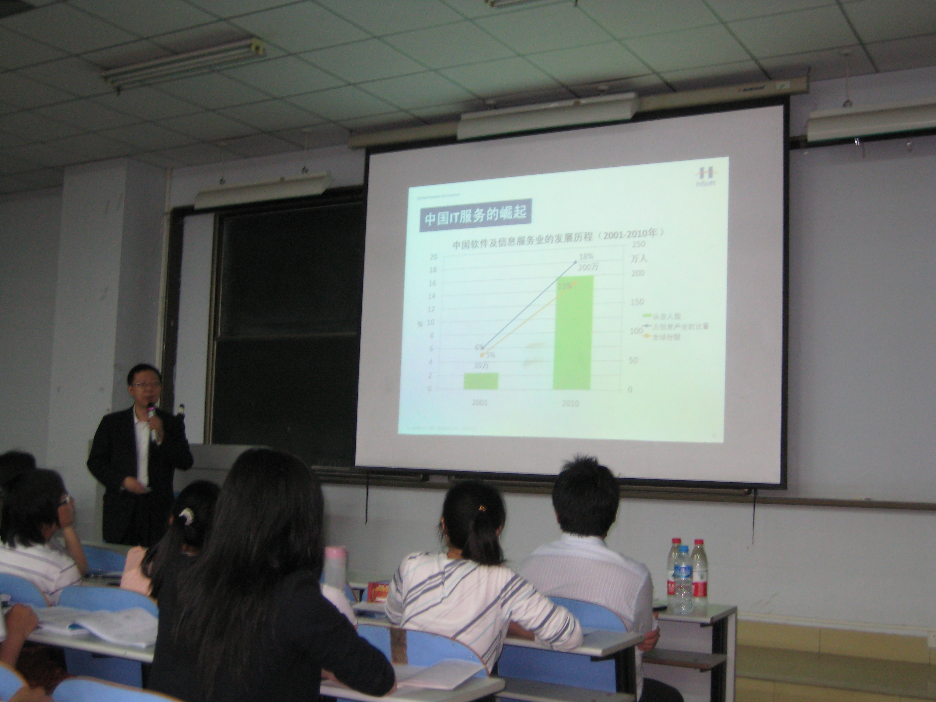 软件学院请海辉软件(国际)集团市场总监冀勇庆先生做“软件服务外包发展趋势”讲座,使同学们能了解软件行业发展的趋势,明白行业岗位对技术和能力的要求,提升同学们对专业知识学习的兴趣,为就业做好准备。 软件学院 2011年05月19日