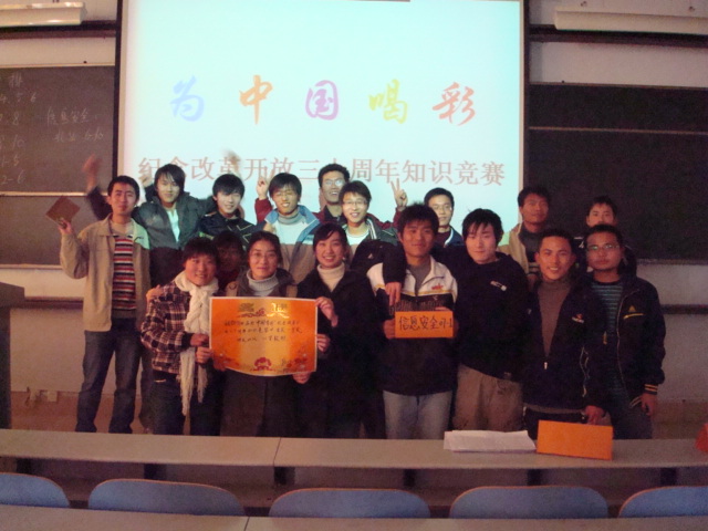 知识竞赛分为两个赛场进行,竞赛内容主要以改革开放相关知识为主,共分为必答,抢答,急中生智,破釜沉舟四个环节。竞赛题目新颖多样,而选手们也使出了浑身解数来回答每个问题,场面热烈而扣人心弦。经过激烈角逐:第一赛场,信息安全07-2班获得冠军,网页08-2班、软测08-2班分列二、三名,优秀组织奖则由网页08-2班、