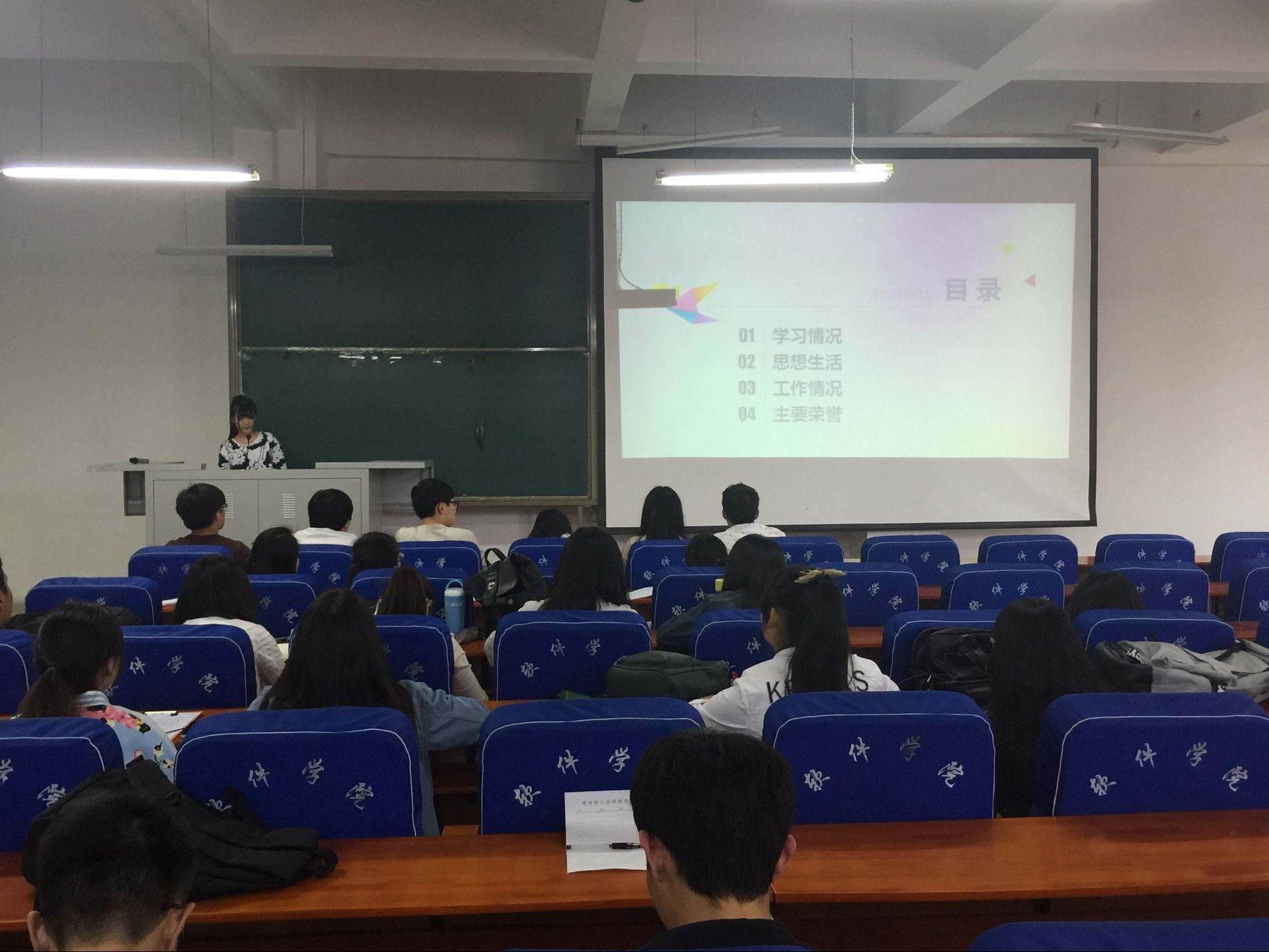 经个人申报、班级推荐,共有36名同学进入学院演讲答辩环节,选手们根据抽签顺序依次上台进行主题演讲,从学习、工作、生活三个方面总结自己的大学生活,具体阐述了自己在大学期间的获奖情况,在班级、学院开展工作情况以及与同学们日常交往情况。参与省先进班集体评选的班级以PPT的形式将自己所在班级的思想建设、学风建设、团日活动、志愿活动、公益服务、学科竞赛等方面的工作开展情况展现在大家面前,供同学们交流学习。候选人演讲内容丰富,情感真挚,赢得了在场师生的阵阵掌声,将现场气氛一次次推向高潮。