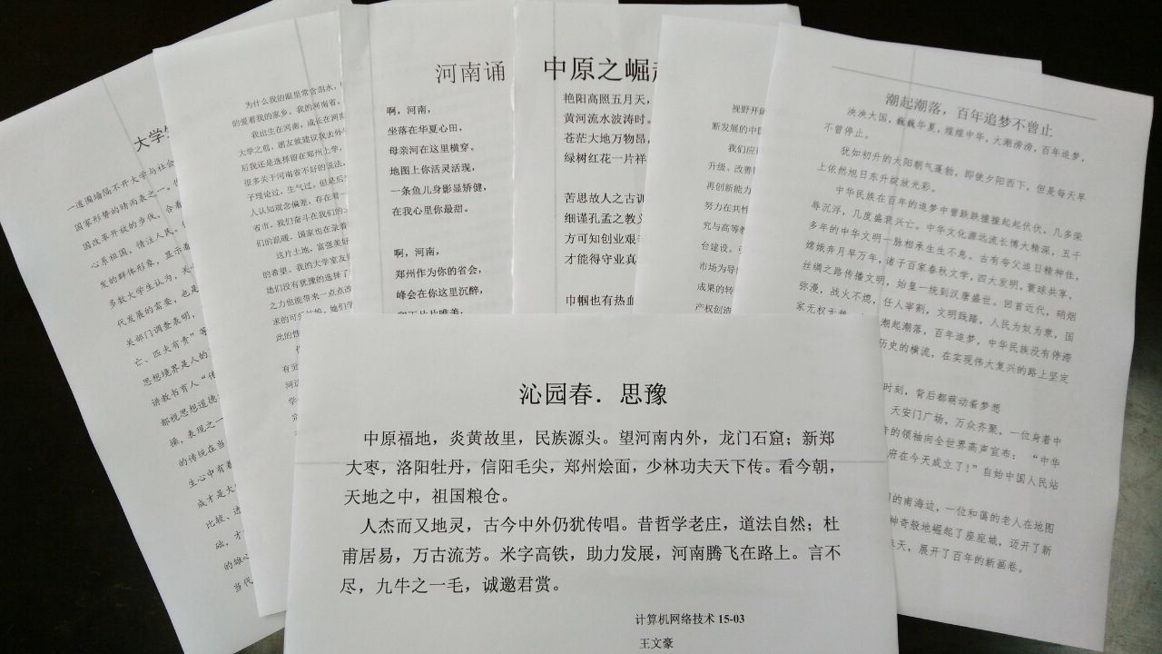 本次征文活动以“思豫”为主题,着力宣传和体现我省“十三五”规划,全面推进“四个河南”建设取得的巨大成就,培育和弘扬社会主义核心价值观。作品分小说、诗歌、散文、杂文、记叙文五类。征文活动共征集到作品168份,征文内容积极向上,展示出了大学生朝气蓬勃、奋发进取、勤于学习、谦虚谨慎、艰苦奋斗、有所作为、善于创造、甘于奉献的精神风貌。经学院评审小组对作品精心评选,软件测试技术2014级2班常艺茹等5名同学获得一等奖,软件会计2015级1班叶琼等10名同学获得二等奖,计算机网络技术2015级3班王佳佳等20名同学获得三等奖。活动结束后,我院将推荐优秀获奖作品参加学校和全省的征文比赛。