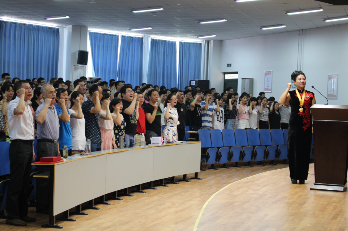 报告会前,在薛荣书记的领誓下,现场师生面向党旗,庄严宣誓,重温入党志愿。在报告中,薛书记声情并茂地讲述了其出生在雪域高原,成长在火热的军营,上过上、下过乡,当过知青,上过大学,做过工程师,以及下岗创业的非凡经历。在上世纪80年代末国有企业改制中,她主动放弃领导干部身份,开启自己的创业之路。在历经九次创业失败后,薛书记带领16位下岗姐妹于1994年成立了郑州市第一家保洁公司,经过八年的苦心经营,公司发展渐趋稳定,但又遇到了留不住管理人员的发展瓶颈,她力排众议,于2002年成立了非公基层党组织,开创了民营企业的先河。随着基层党组织凝聚力、吸引力、感召力的不断增强,党员的先锋模范作用也日益凸显,在非典等急难险重工作面前,共产党员冲锋在前,出色地完成了工作任务,受到了服务单位的高度评价。公司规模也不断壮大,现已发展为员工4.2万余人,经营收入10亿元,全国10个子公司、32个分公司,集物业、劳务派遣、清洗保养、母婴护理、旅游服务、残障帮扶等行业为一体的大型集团公司。在事业成功的同时,薛书记也勇于承担社会责任,五年间帮扶助残300多次,吸纳了许多残疾人员工,成立中原非公企业精准扶贫联盟,先后创办“薛书记有约工作室”和“薛书记今日播报”宣传党和国家最新大政方针。薛书记还分享了今年“七一”等三次受到党和国家领导人亲切接见时,激动而又自豪的心情。