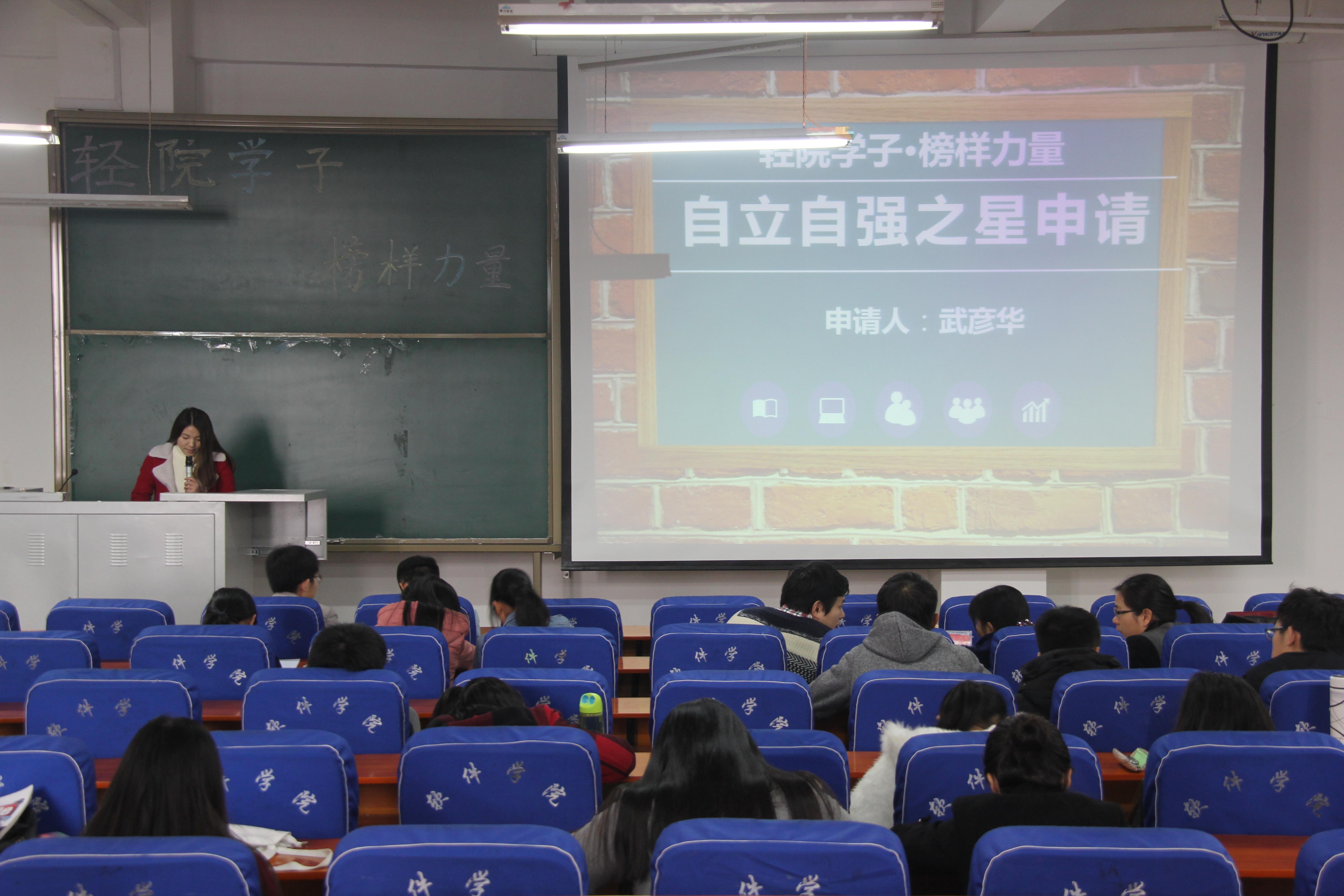 本次“轻院学子•榜样力量”评选共分为自立自强之星、创新创业之星、志愿服务之星和文艺体育之星。评选以班级团支部为单位,以班级团日活动等形式推选出优秀典型榜样。各位候选人通过精彩的演讲,向大家展示自己的风采。自立自强之星候选人向大家展示了他们不畏困难积极向上的面貌;创新创业之星候选人向大家展示了他们积极实践、勇于创新精神;志愿服务之星候选人向大家展示了他们心系社会、甘于奉献的热情;文艺体育之星候选人向大家展示了他们热爱文体、追求健康生活和用文体服务大家的激情。候选人准备充分,语言简练,展示出自身特长与所获成绩,展现出了学院学生昂扬向上、青春亮丽的精神风貌。候选人用自身的优秀事迹和人格魅力吸引着观众们的注意力,活动现场气氛热烈,掌声不断。