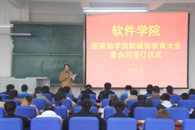 为了进一步做好2018年国家助学贷款工作,软件学院分别于11月7日中午和11月8日中午在科学校区软件楼219和禹州实训基地3号楼B座303教室,举行2018年度国家助学贷款诚信教育大会暨合同签订仪式。负责贷款的李辉老师和2018年度校园地国家助学贷款学生参加了会议。