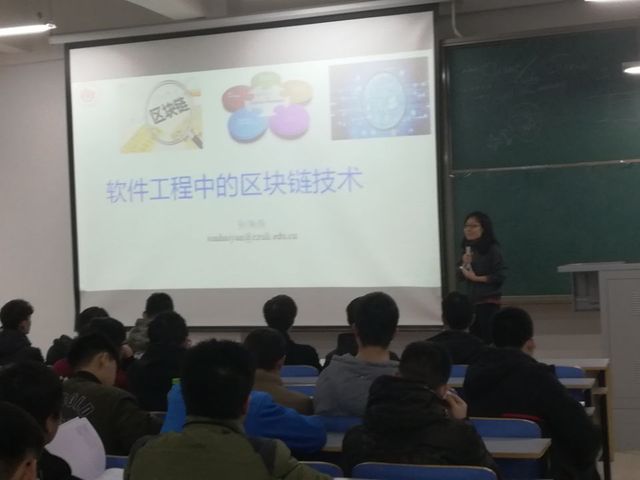 2018年12月26日下午,软件学院孙海燕博士在软件楼503室作了题为“软件工程中的区块链技术”的报告。报告会由软件学院副院长邓璐娟主持,软件学院教师和2018级软件工程专业303名学生参加了报告会。