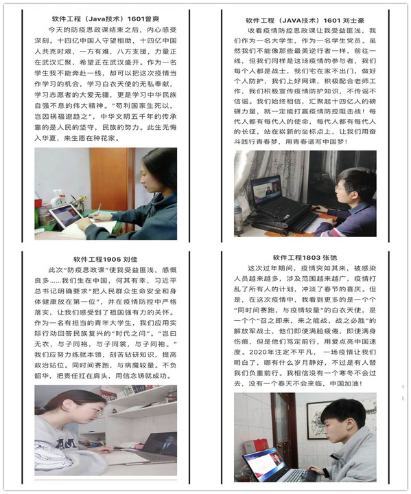 来自清华大学、中国人民大学、北京师范大学和中央财经大学的四位名师“云端开讲”,与广大师生共同探讨这场疫情告诉了我们什么、疫情防控中青年的责任与担当,老师们通过一个个鲜活的例子,一组组权威的数字,充分展示了中国防疫“硬核”力量,彰显了守望相助、共克时艰的中国精神。四节生动的思政课在学生当中引起强烈反响。观看学习视频后,学院组织同学以班级为单位,就思政课内容进行专题分享讨论。讨论会中,同学们纷纷在群里表示,本次防疫工作凸显了我国制度的优越性,全国人民在中国共产党的领导下众志成城,取得了显著的效果,大家为自己是中国人而自豪,同学们一致表示,要用青春做画笔,答好这场疫情的大考。