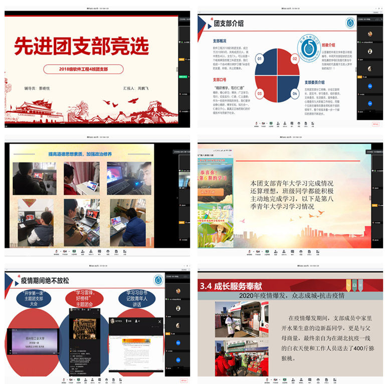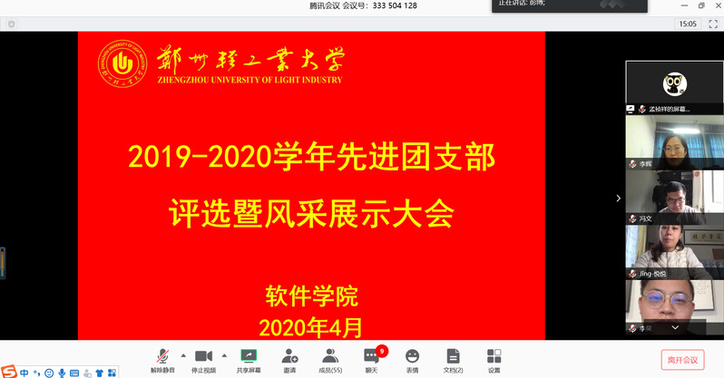 4月2日下午,软件学院在腾讯会议室举办了线上先进团支部评选暨风采展示大会。我院辅导员参加活动并担任评委,2017级、2018级、2019级一共12个团支部参与竞选,各团支部进行线上观摩学习。