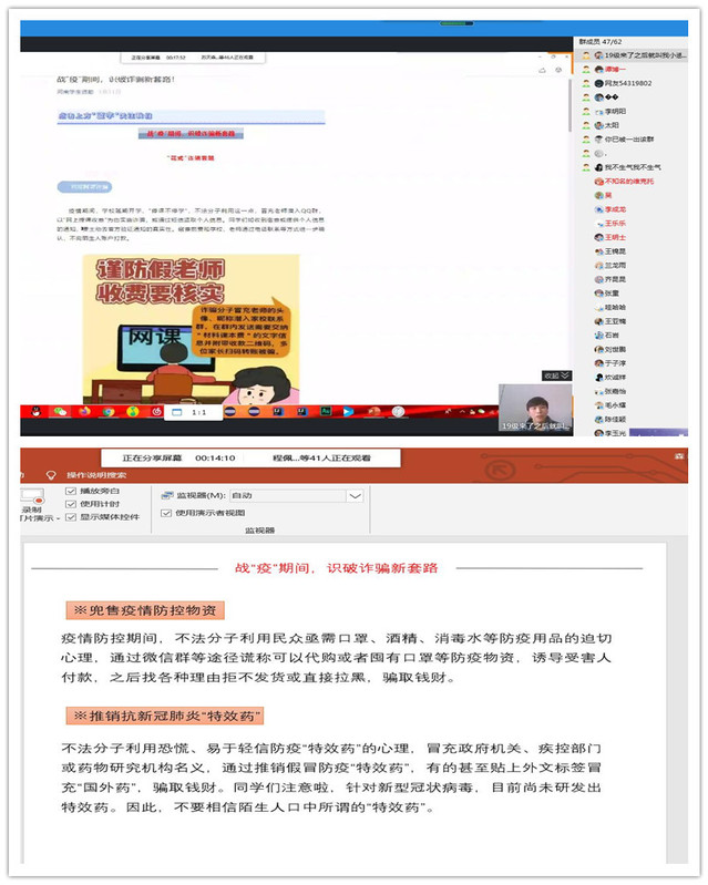 为加强疫情期间学生的防诈骗意识,帮助学生远离网络诈骗,软件学院组织各班4月底开展了“战‘疫’期间,识别诈骗新套路”的主题班会。