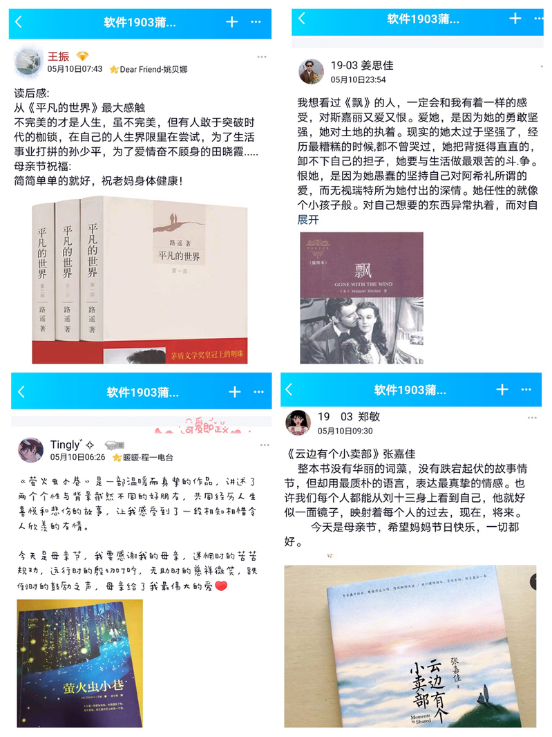 5月10日下午举行了主题为“读高雅书,做高尚人”的蒲公英心理素质提升活动,软件工程19级3班全体同学参与了此次活动。活动的初衷是让同学们与经典同行,与名著为伴,充分感受好书的魅力,让好书走进生活,让阅读成为大家的习惯,提升同学们的知识素养;让大家在不能出门的疫情期间,感受到读书的乐趣,感受到充实感,调节同学们的一些消极的情绪。