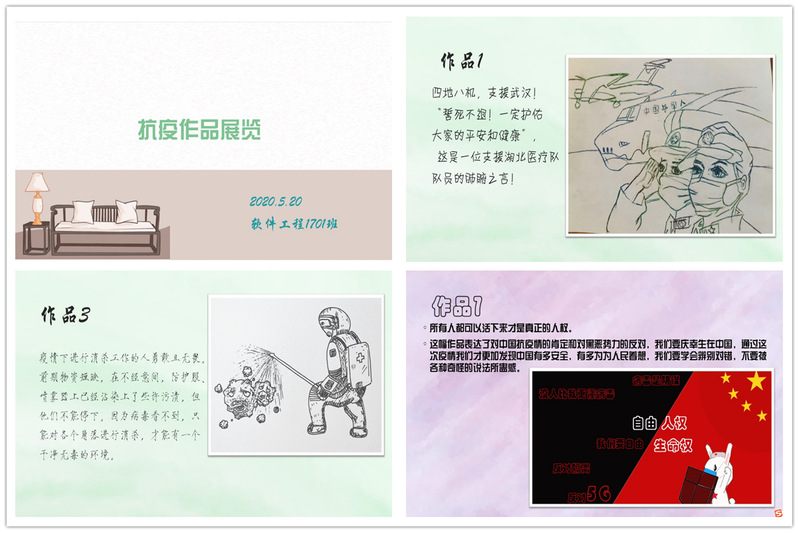 2020年5月底,软件工程1701班的抗疫绘画活动的收集任务结束,开始了正式展览和评选。在征集过程中,班级同学踊跃报名,为抗疫发声,用自己的方式为武汉加油。一个优秀作品的作者介绍道:“支援武汉!誓死不退!一定护佑大家的平安和健康,这是一位支援湖北医疗队队员的肺腑之言!他们是我们学习的榜样”。大学生通过自己的作品表达出对抗疫工作支持的决心,也表达了对艺术的认真和生活的认真,从作品中我们感受到了同学们的上进心和积极参与活动的热情。