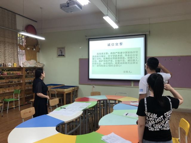 李辉老师详细了解了同学们实习期间的生活、学习和工作等情况,并对同学们进行了励志动员和诚信教育。她指出,党和国家高度重视家庭经济困难学生的资助工作,学校认真贯彻落实相关政策确保了经济困难学生健康成长成才并顺利完成学业,希望同学们正确看待当前的困难,树立坚强的自信心,培养自主、自强和自立精神,以更加积极的态度,妥善安排自己的工作和生活,做克勤克俭的榜样,早日成为国家栋梁之才。作为国家助学贷款的受益者,希望同学们坚守诚信,按约还款,以自己的实际行动回报社会,同时鼓励贷款学生尽早还款。接下来,李老师对毕业前的各项贷款工作做了安排,详细讲解了贷款学生在线服务系统的使用方法和支付宝还款相关事宜,随后,贷款同学进行了贷款相关知识的测试,并认真填写了毕业确认材料,最后进行了诚信宣誓。