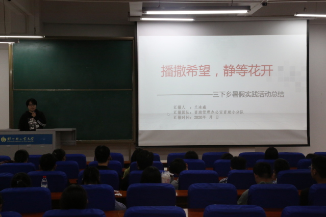 大会中,优秀项目代表依次上台发言,并借助PPT、视频等方式,从主题方案、活动开展、实际成效、媒体宣传等方面向老师和同学展示实践的丰富成果,分享了彼此的感悟及体会,使在场同学既获得了宝贵经验,也产生了情感上的共鸣。其中,国家资助宣传政策小分队走进贫困地区,宣传国家扶贫政策,为打赢脱贫攻坚战贡献出属于自己的一份力;软件学院云服务志愿服务队依靠自己所学的专业知识,为社区居民修理电子产品,普及电脑基础知识;寻英筑梦党团实践小分队紧贴时代脉搏,追寻党的足迹,体会新时代革命精神;“追创业之梦,悟就业之实”小队在暑假期间走进郑州新开普公司,观察当下就业环境,寻找就业新契机。最后学生会执行主席赵汉林对此次社会实践大会做出总结,他倡议所有同学充分认识社会实践的重要意义,积极投身社会实践活动,在实践中受教育、得锻炼、长才干、作贡献,用青春实践向伟大祖国告白。