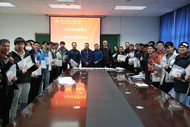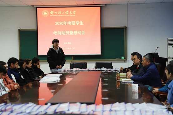 首先,学院党委书记武丰龙为正在冲刺的考研学生送来祝福,鼓励同学们持之以恒、决战考研,以不放松的姿态向着既定目标不断前进,武书记讲到了国家在新冠疫情防控方面,学校在建设高水平轻工业大学方面,学院在特色示范性软件学院等方面取得的成绩,激励同学们秉持“为之则易,不为则难”的校训精神,努力拼搏,牢记科技强国使命,担当创新报国重任。随后,老师们针对同学们考前的心态、饮食、作息等生活方面存在困难提出了有效的解决方法和积极建议,学生代表尚守信代表全体考研同学对全体领导老师表示感谢,并用十天可以建造一座雷神山的例子来鼓励大家坚持最后十天,查漏补缺,迎难而上,以优异的成绩回报学院的培养和关怀。最后,学院领导老师为全体考研学生送上考研“加油包”。