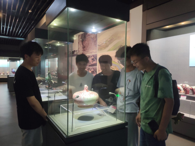 禹州钧官窑址博物馆是我国唯一一座钧瓷专题博物馆,共分为六个展厅。同学们首先参观了大禹之州展厅,顺着指示牌,大家参观了颖水长流、故地先贤、明清禹州、盛世瓷珍、颍川古郡、逐鹿年代、禹迹王踪、史前岁月等主题展,禹州悠久灿烂的历史文化使大家唏嘘不止。接着同学们来到浴火千年之展厅,禹州陶瓷发展的久远历史以及钧瓷历经的浴火淬炼历历在目,大家欣赏着、讨论着、品味着一幅幅承载着厚重历史的记录、惊叹于这段文明不朽的传承、思索着其在中国陶瓷史、工艺美术史上的地位和广泛的文化影响。最后同学们进入万彩永辉展厅,了解了现代钧瓷和钧瓷艺术发展的辉煌成就和钧瓷鉴赏方面的知识。