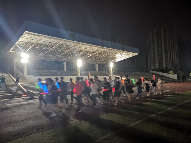 随着夜幕降临,学生会工作人员开始在运动场布置现场,同学们兴致勃勃到操场主席台下领取了荧光棒。晚上七点活动正式开始,248名参与者拿起荧光棒、带上荧光头箍,整理好队伍。首先他们在运动场主席台下组成“100”的字样,并集体喊出“学党史、庆百年、强体魄、跟党走”的口号,向党的百岁华诞送去祝福;接着,由班长带领各自班集体,迈着有力的步伐一起出发,同学们喊着各自班级集体的口号,追随着党旗,以昂扬的姿态跑步前行,把整个运动场装点成了一道道亮丽的风景线。