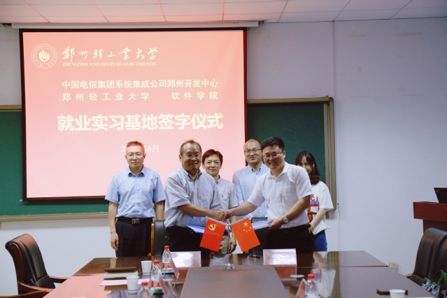 会上,万顺国主任简要介绍了学校的基本情况和近年来毕业生就业工作开展情况,对郭建章先生一行表示欢迎。学院院长张素智从教育教学、科学研究、学科建设等方面,对学院进行了简要介绍。中国电信集团系统集成公司郑州开发中心总经理郭建章先生介绍了公司的基本情况和郑州开发中心未来的发展规划,表达了对软件学院毕业生的认可和进一步深化校企合作的具体想法。随后双方在人才培养、科学研究、学生实习等方面的合作意向进行了深入交流,重点就“电信订单班”的选拔、实施、培养进行了讨论,基本达成一致意见。学院党委书记武丰龙讲话中指出,今年的毕业生中,我校24名同学签约并顺利入职电信集团系统集成公司,为进一步校企合作奠定了基础,下一步校企双方共同努力,搭建稳定的校企合作平台,实现互利共赢。最后,张素智院长和郭建章先生分别代表校企双方签订了《就业实习基地协议书》。
