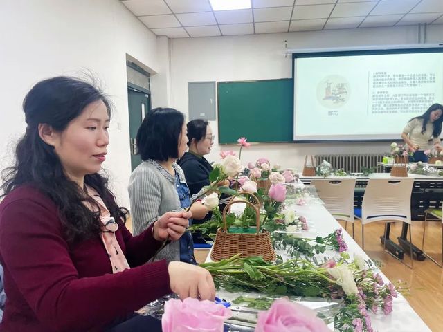 万物复苏,春暖花开,活动现场一片花海的景象,付玉老师首先介绍了所用花材的名称、插花工具的使用、插花时的应用技巧,而后付玉老师就花篮的制作过程进行了演示,听着讲解过程,老师们发挥想象力,根据自己的喜好老师们对花朵进行搭配。经过这次活动,老师们对花束的整体色彩有了基本的把控,对花篮空间的填充有了基本的认识。
