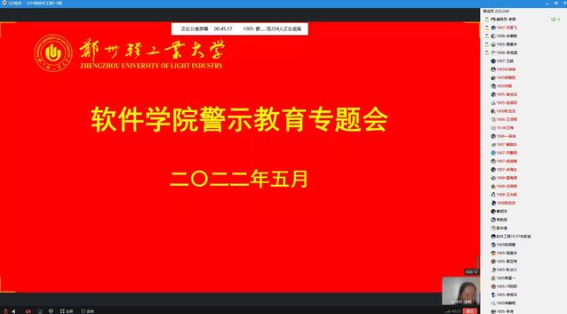 为充分发挥纪律处分的警示教育作用,进一步约束学生遵守校规校纪和学校疫情防控规定,软件学院于5月14日下午召开警示教育专题班会,学院党委副书记马欢、学院全体辅导员、全部在籍在读学生参与了会议,会议采取线上形式开展,覆盖学生人数2401人,覆盖率达100%。