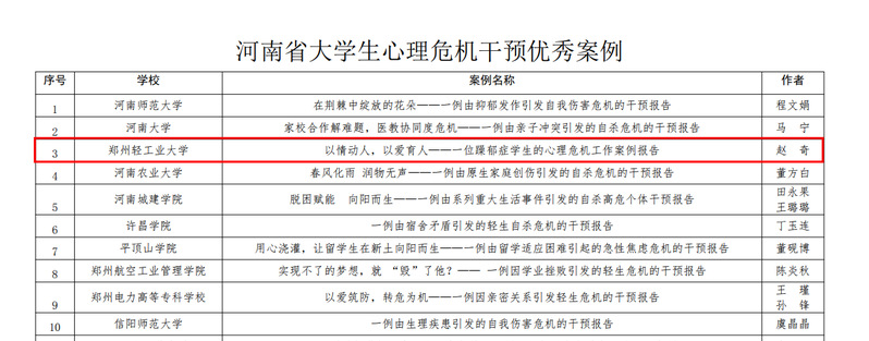 近日,河南省委教育工委、河南省教育厅发布《关于公布全省高校大学生心理健康教育优秀课程及心理危机干预案例评选结果的通知》(豫教工委〔2024〕8号),我校心理健康教育中心教师赵奇申报的心理危机干预案例《以情动人,以爱育人———一位躁郁症学生的心理危机工作案例报告》被评为河南省大学生心理危机干预优秀案例。