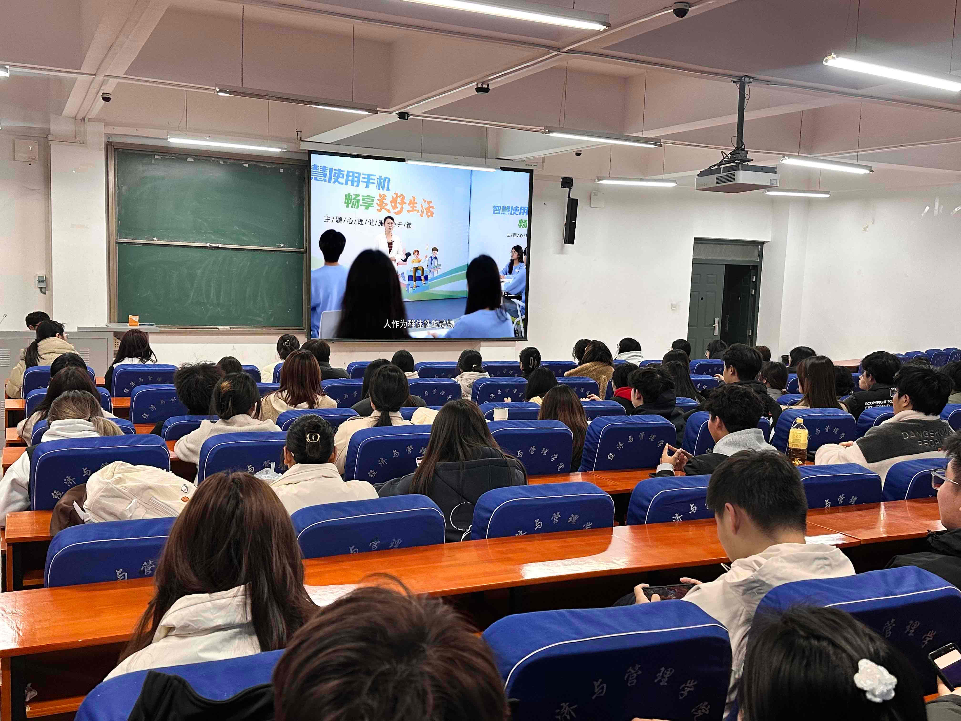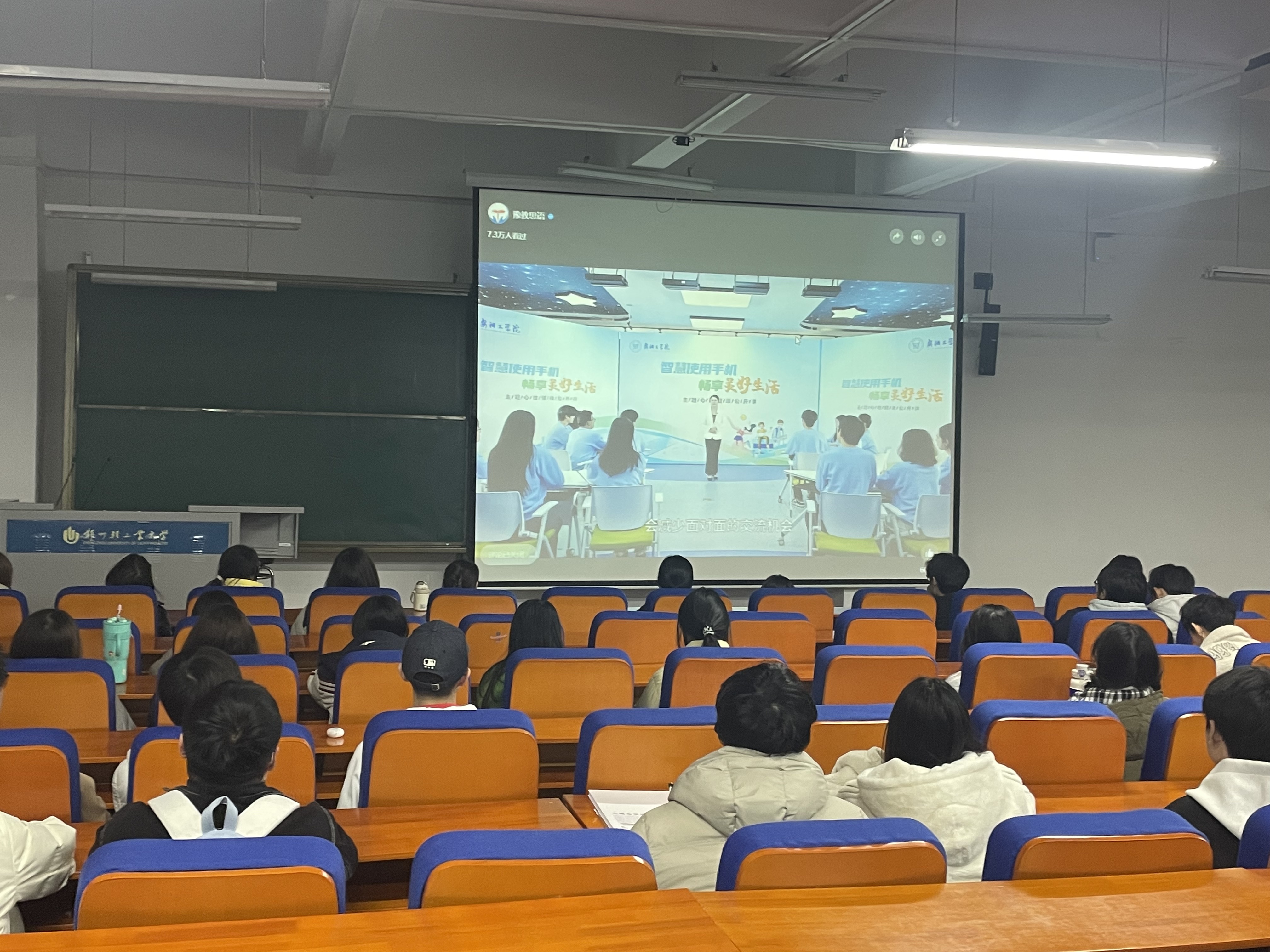 主讲老师通过师生互动和调研报告分析,引出智能手机使用的“双刃剑”效应,引导学生思考“如何平衡科技便利与心理健康”;通过动画展示和校园采访,生动阐述过度依赖手机的脑神经机制、心理机制及行为机制及负面影响,引发了同学们对过度使用手机所带来的负面影响的共鸣;通过小组讨论和知识讲授,从“设定目标”“发展爱好”“扩大社交”“建立习惯”四个维度,帮助学生掌握智慧使用手机的方法;最后三位同学分别分享了他们在科技创新、社会实践、文艺领域的成长故事,激励同学们积极行动,从自身做起,实现科技与生活的平衡。