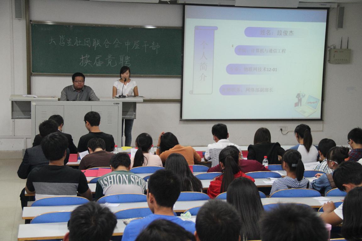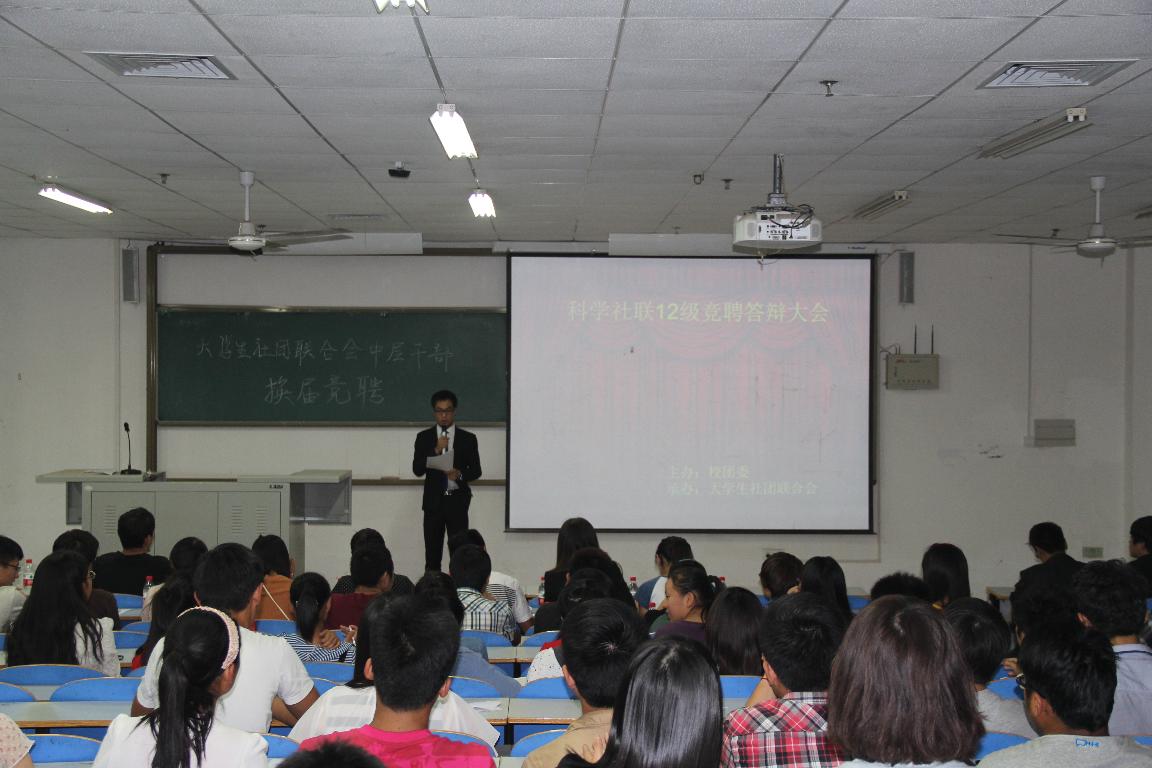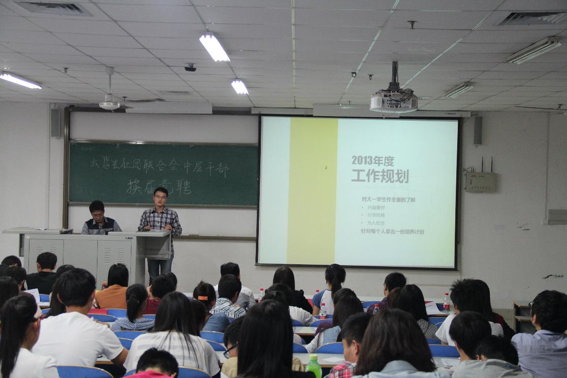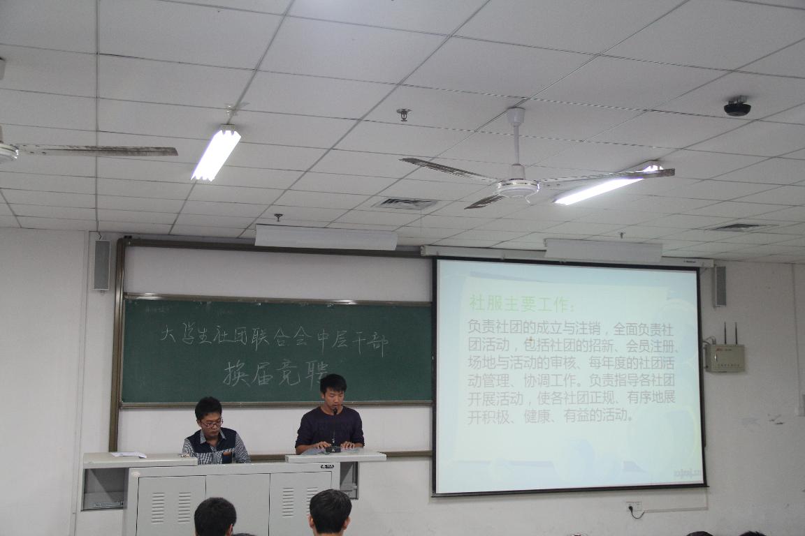 2013年10月10日,在科学校区电教楼103室举行了大学生社团联合会中层干部换届大会。莅临本次会议的嘉宾有校团委杨阳老师、社联全体成员以及各校级社团负责人。会议由社联11级成员赵墩主持。