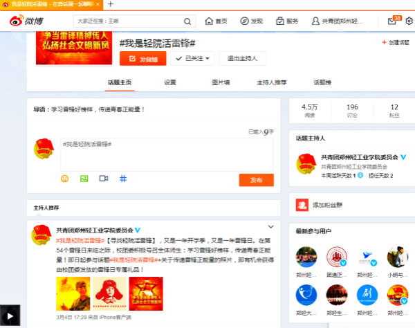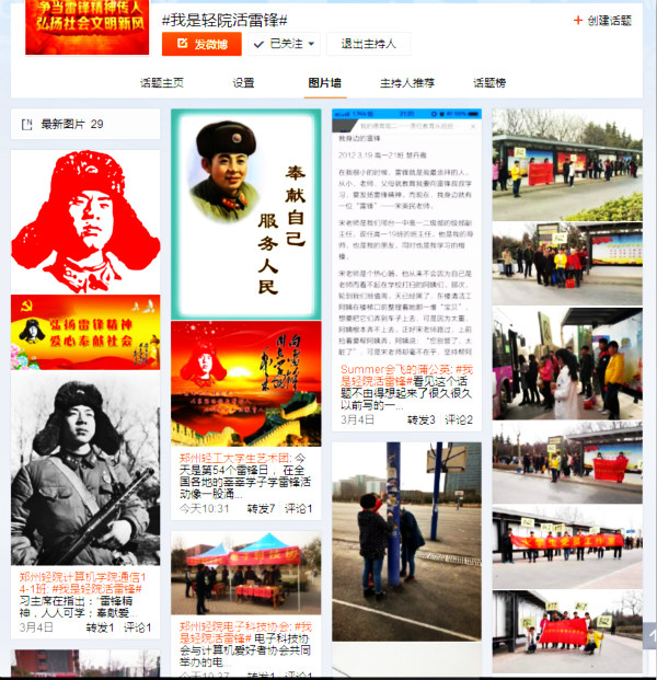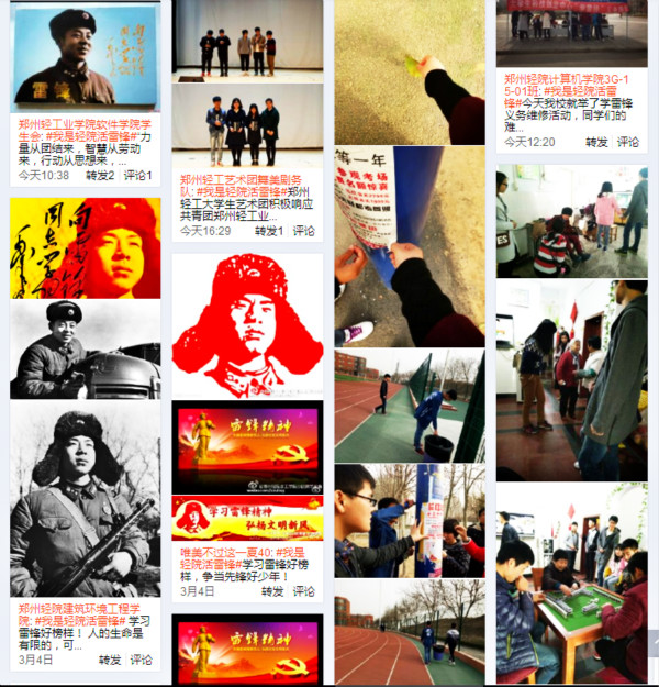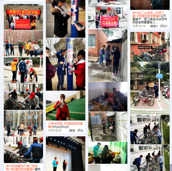 在校团委微博发起的“#我是轻院活雷锋#”微博互动话题中,师生之间进行热烈互动,畅谈学习雷锋精神、争做轻院活雷锋的感受和体会,各团学组织的志愿活动和精彩讨论得到了同学们的点赞、转发(截止发稿阅读量4.5万);在“关爱孤寡老人”活动,同学们走进恒爱敬老院、老年公寓等地,通过义务劳动、文体活动、交流谈心、亲情陪伴等方式开展志愿服务,为老人带去节日的祝福,传承敬老爱老的传统美德;在“清洁校园”活动中,同学们积极整理校园树木、花台和小广告,清除校园中卫生死角,打扫自行车车棚并摆正自行车,从点滴小事体悟无私奉献的精神;在“家电义务维修”活动中,许多老师、同学都把自己的电脑或小家电抱过来维修,咨询使用过程中遇到的问题,服务队的同学们都热情、耐心地给予解答,并修复了90%以上的送修电器;在“志愿献血服务”活动中,有的同学在献血处引领献血者进行献血工作,有的在休息处为献血者提供豆浆和面包,同时进行无偿献血证和奖品的发放,有的在为献血者们提供帮助并讲述关于献血的注意事项。