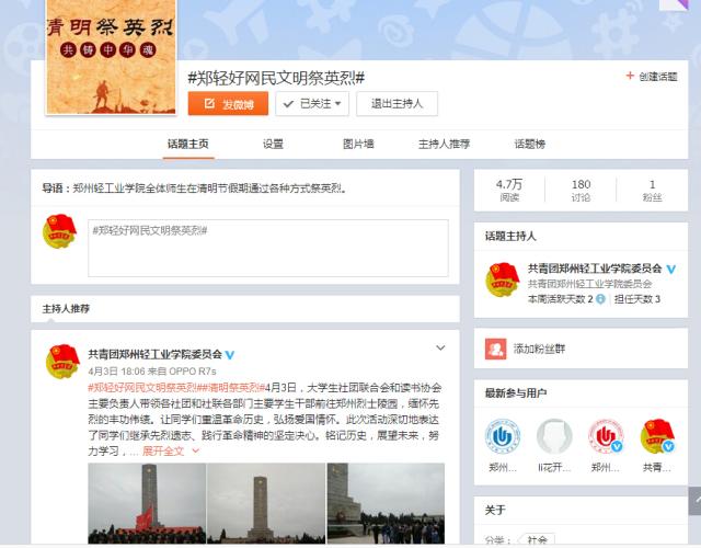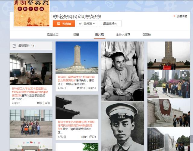 在校团委微博发起的“#郑轻好网民文明祭英烈#”微博互动话题中,团员青年用最朴实且最真诚的语言表达着对先烈们的缅怀之情,阵阵温暖在指尖流动,句句温情在网络上传递。各团学组织的祭英烈活动和精彩讨论得到了同学们的点赞、转发(截止发稿阅读量4.7万)。