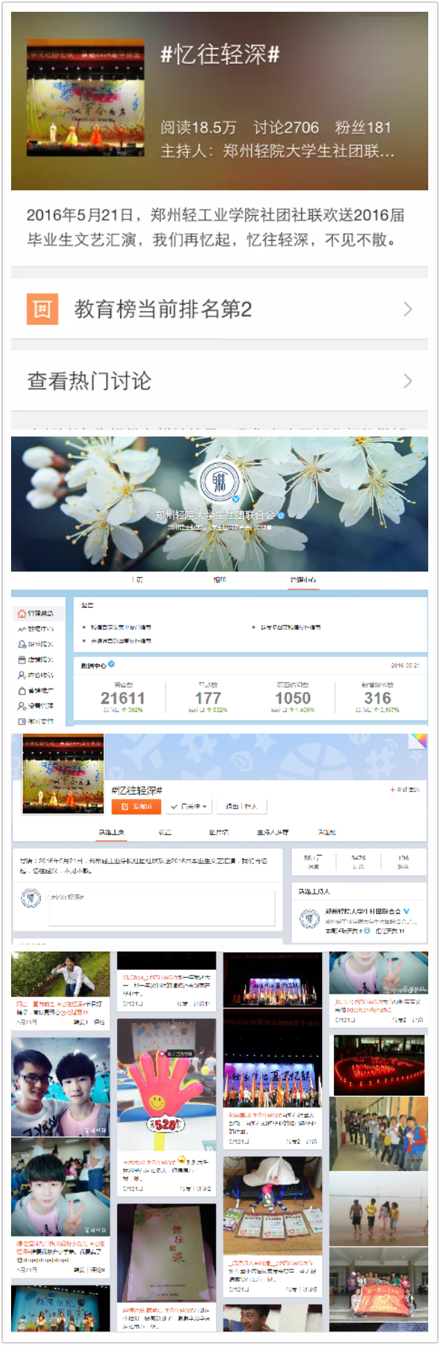 5月21日下午和晚上,由校团委主办、大学生社团联合会承办的欢送2016届毕业生文艺汇演分别在东风校区大礼堂和科学校区三教楼208成功举办。其中东风校区文艺汇演以“轻缘梦始,夏末忆起”为主题,85级校友作为嘉宾也被邀请到场,科学校区以“轻风徐来,凤凰花开”为主题,校团委书记葛勋、副书记景志勇、各学院分团委书记和老师,以及各学院同学参加了文艺汇演。活动期间,场内外观众积极参与微博话题忆往轻深互动,截止5月22日晚十二点,微博话题阅读量达58.1万,参与话题讨论3476。