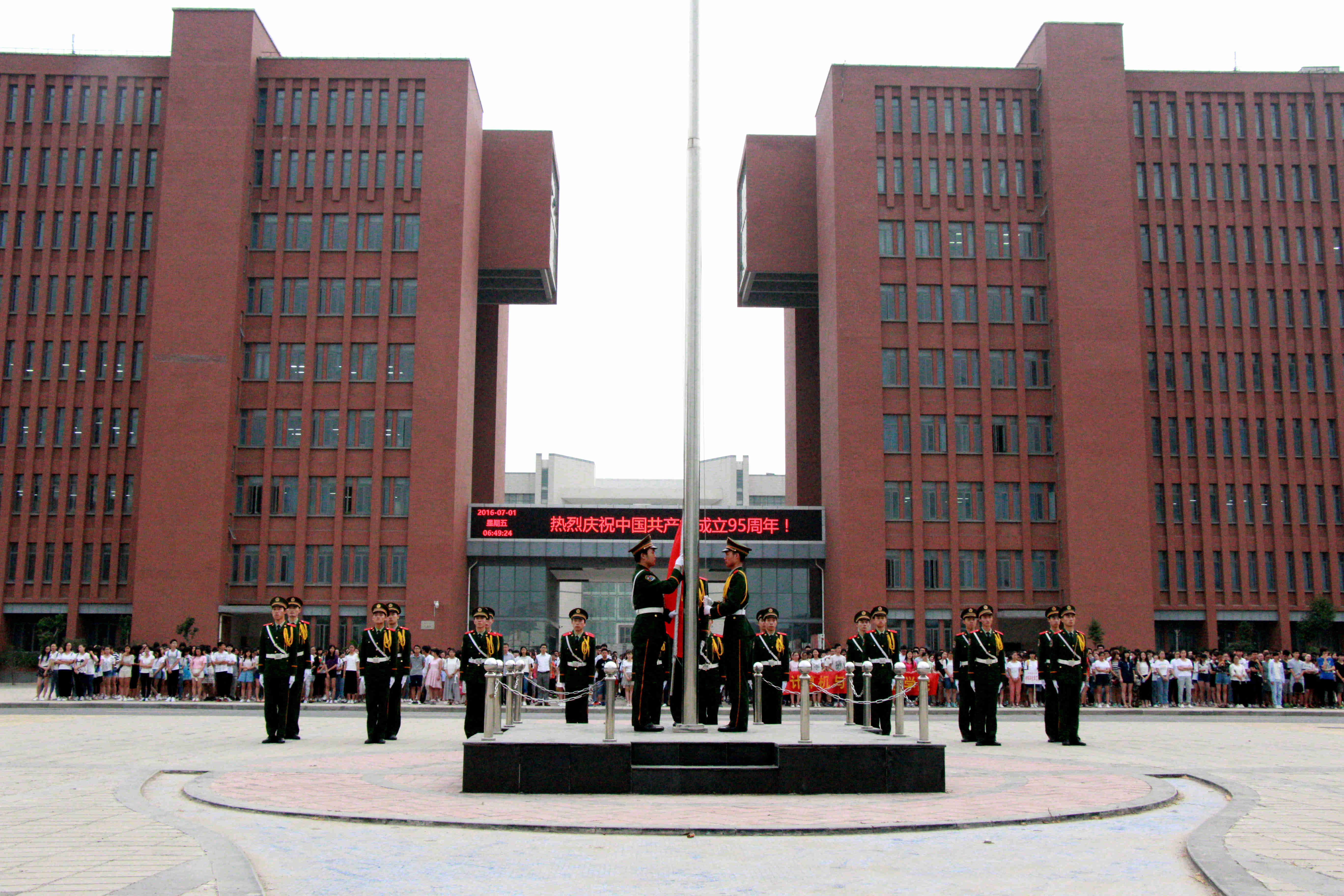 值第95个建党节到来之际,7月1日清晨6:30,我校“庆祝建党95周年”主题升旗仪式在两校区隆重举行,校团委全体人员、学院分团委书记,全校学生党员、团员代表等青年大学生近3000人参加了主题升旗仪式。