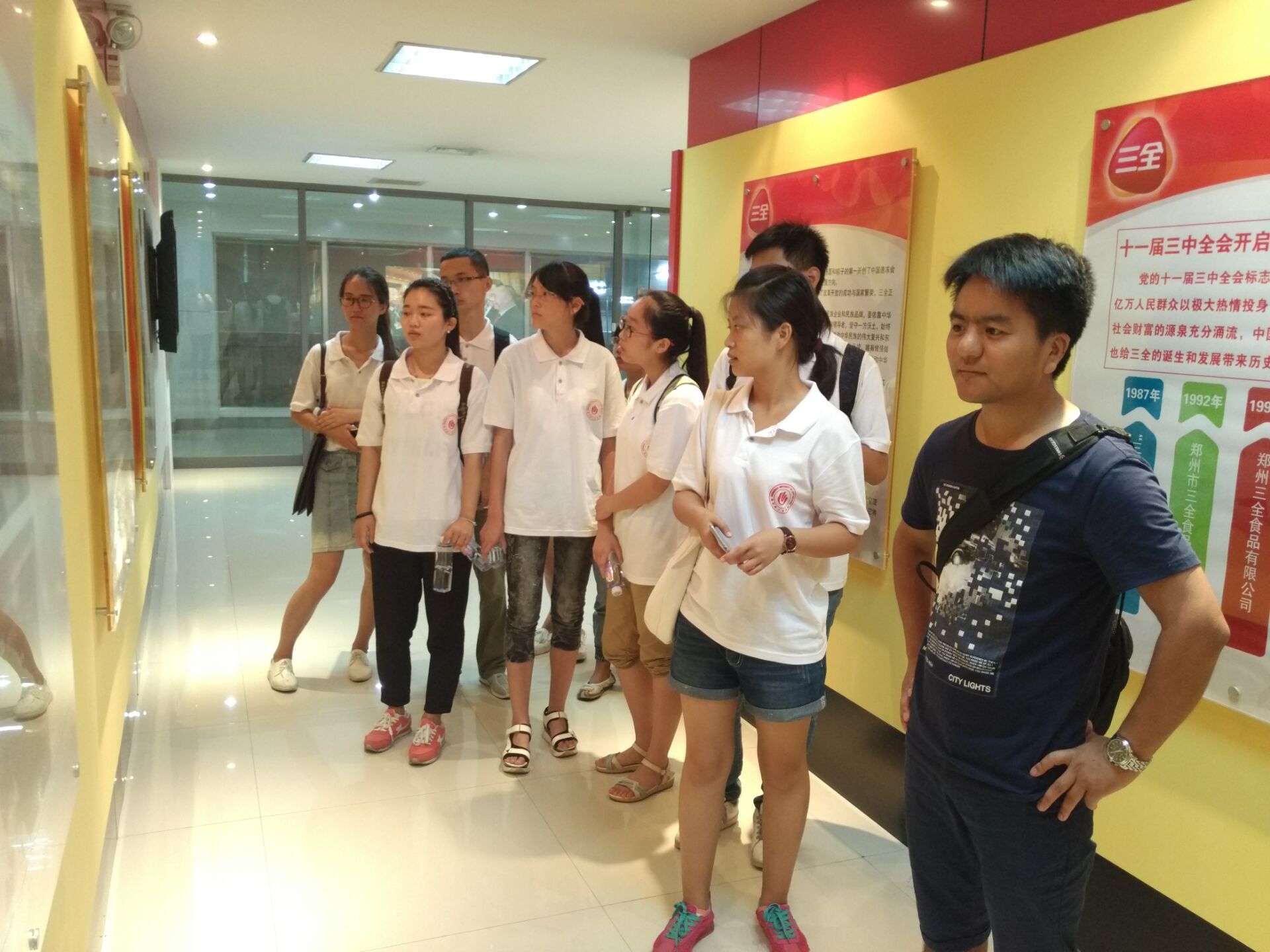 7月11日,小分队抵达三全食品有限公司进行参观学习。三全食品有限公司是一个拥有几十条现代化生产线及几万吨低温冷库的大型速冻食品生产企业,主要生产以汤圆、水饺、面点为主的中式速冻及常温食品。公司的工作人员带领队员们参观了生产车间,并讲解了公司的发展历程、创新成果、速冻食品生产的技术要求及生产特点。随后小分队又参观了他们的创新实验室和速冻汤圆的生产流程,直观地感受到了三全公司的高要求、严管理,以及公司求真务实、敢于挑战、勇于创新的态度。感受富强河南,感知发展历程,在三全食品公司进行调研活动的过程中,队员们不仅对食品企业的生产与管理有了较全面的了解,还意识到了创新对企业发展的重要性。
