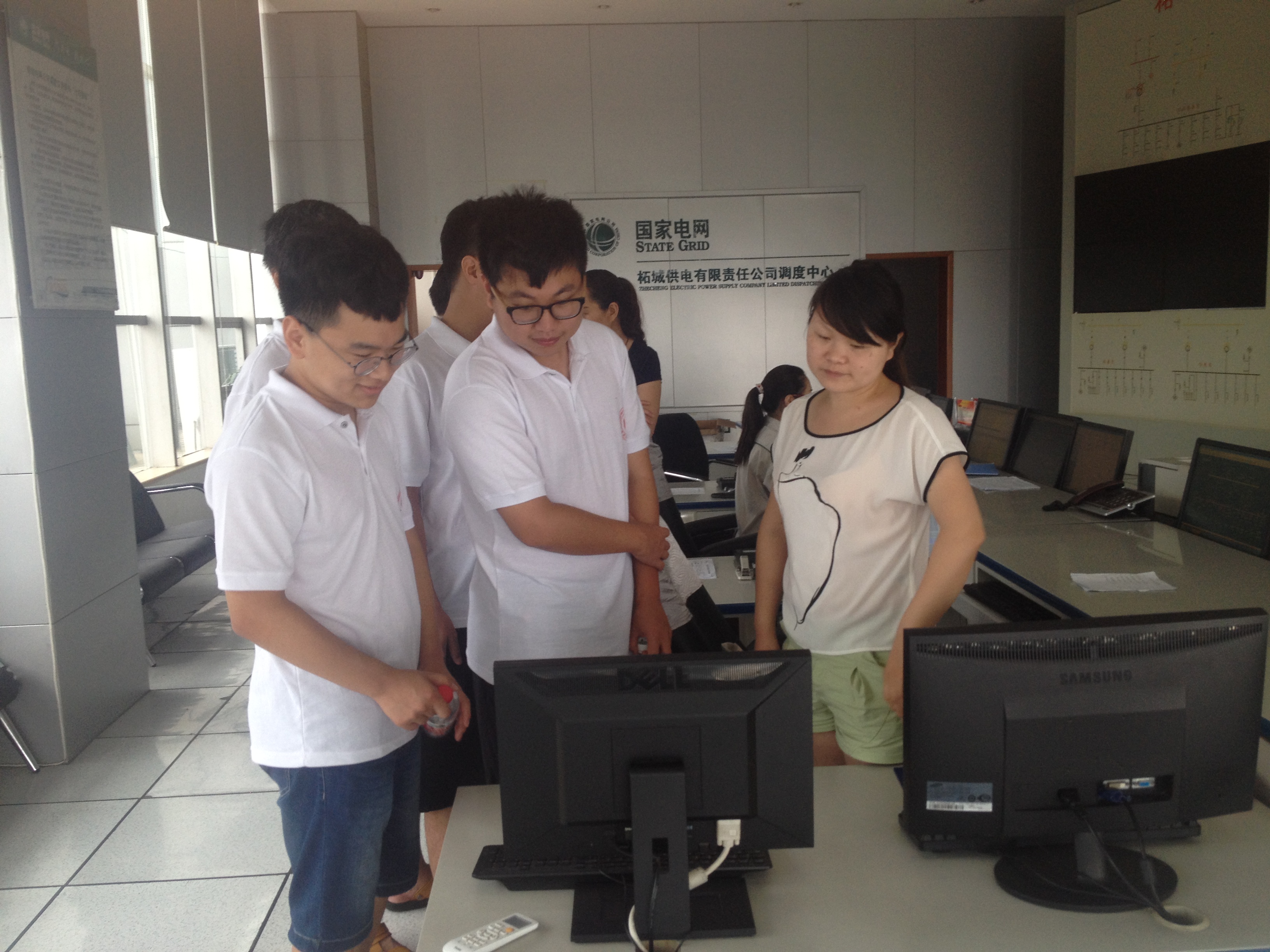 当天下午,小分队抵达商丘市柘城县。队员们查阅了公司的相关资料,在经过充分的准备后,次日前往柘城县邵园变电站。在工作人员的带领下,小分队进入变电站,首先映入眼帘的便是数个超大变压箱,厚厚的电线通向四面八方,变电站内还有一台70年代的机器,上面布满了邵园高压低压变电按钮和信号灯。随后,队员们观看了变电站的监控录像得知现在大多数变电站无人值守,平日只需要少数人维护查看便可以保证变电站的正常运行。在河南省柘城供电公司,队员们发现如今用电情况的统计已经完全基于电脑系统,只需要安装一个总的电表集成就能在电脑上进行实时监控。参观过程中,队员们感受到了电网的智能化与高效化,纷纷被电网智能化带来的快捷与便利所震撼。