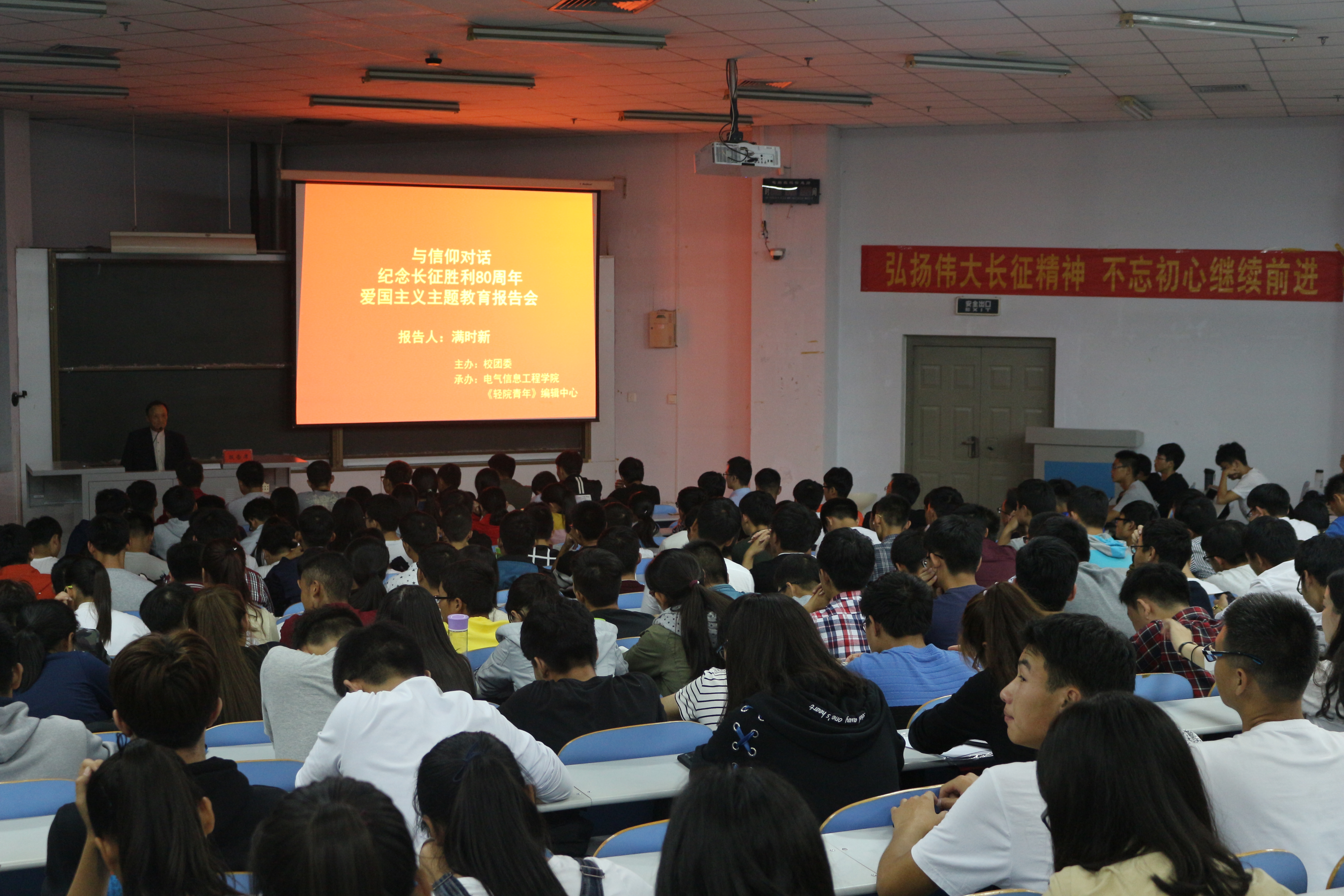 为纪念长征胜利80周年,强化青年学子爱国主义精神,由校团委主办,计算机与通信工程学院、电气信息工程学院承办、轻院青年编辑中心协办的《与信仰对话——纪念长征胜利80周年爱国主义主题教育报告会》分别于10月17日晚7点、10月18日上午10点,在东风校区教三楼203教室、科学校区活动中心208室召开。校团委老师、部分二级学院分团委书记及各院学生代表800余人参加。报告会分别由计算机与通信工程学院分团委书记沈高峰老师、电气信息工程学院分团委书记许海龙老师主持。
